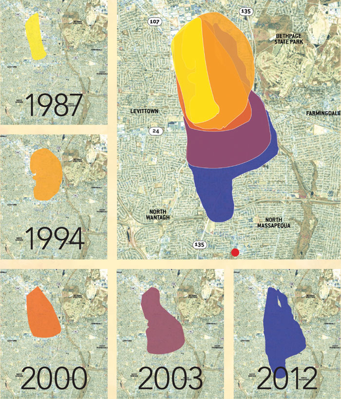 A graphic showing how a plume of contamination from Northrop Grumman’s plant in Bethpage has grown over the years. Source: NYS DEC